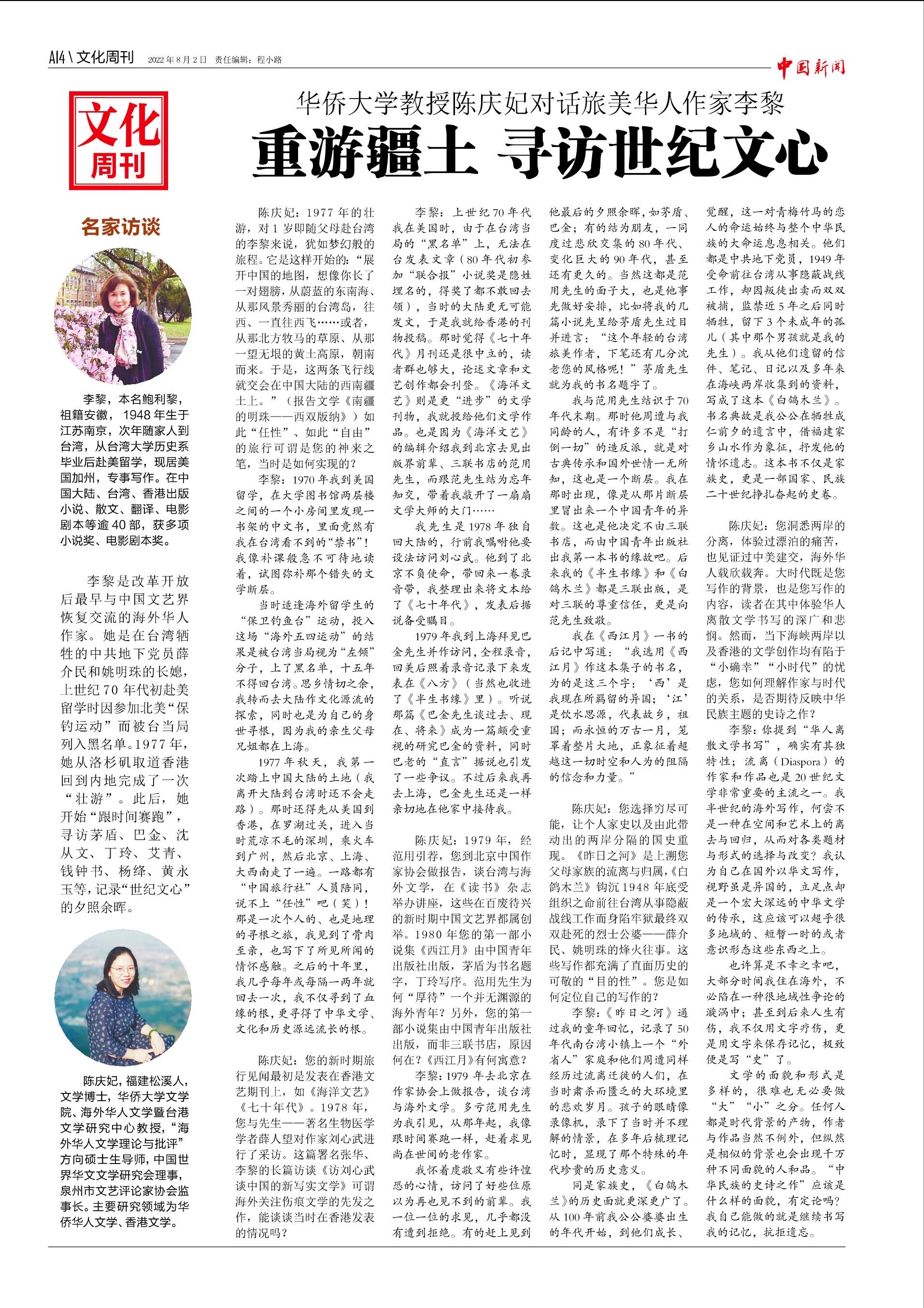 【文化周刊】华侨大学教授陈庆妃对话旅美华人作家李黎 重游疆土 寻访世纪文心