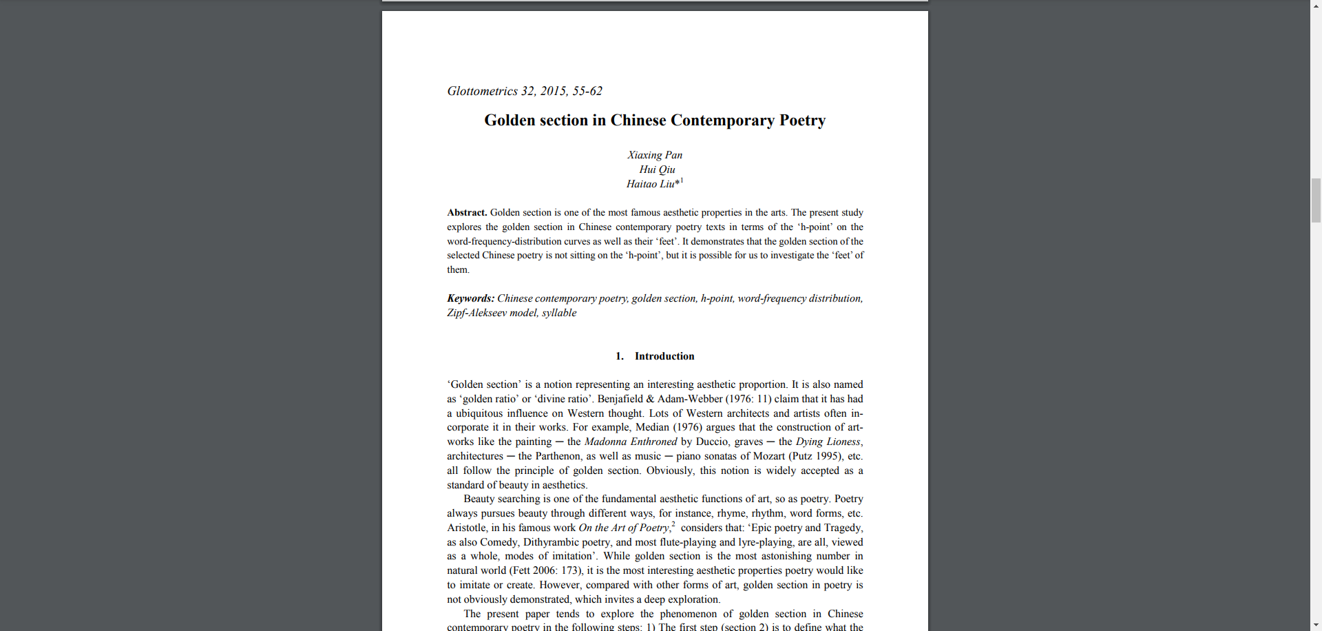 - Golden section is one of the most famous aesthetic properties in the arts. The present study explores the golden section in Chinese contemporary poetry texts in terms of the ‘h-point’ on the word-frequency-distribution curves as well as their ‘feet’. It demonstrates that the golden section of the selected Chinese poetry is not sitting on the ‘h-point’, but it is possible for us to investigate the ‘feet’ of them.