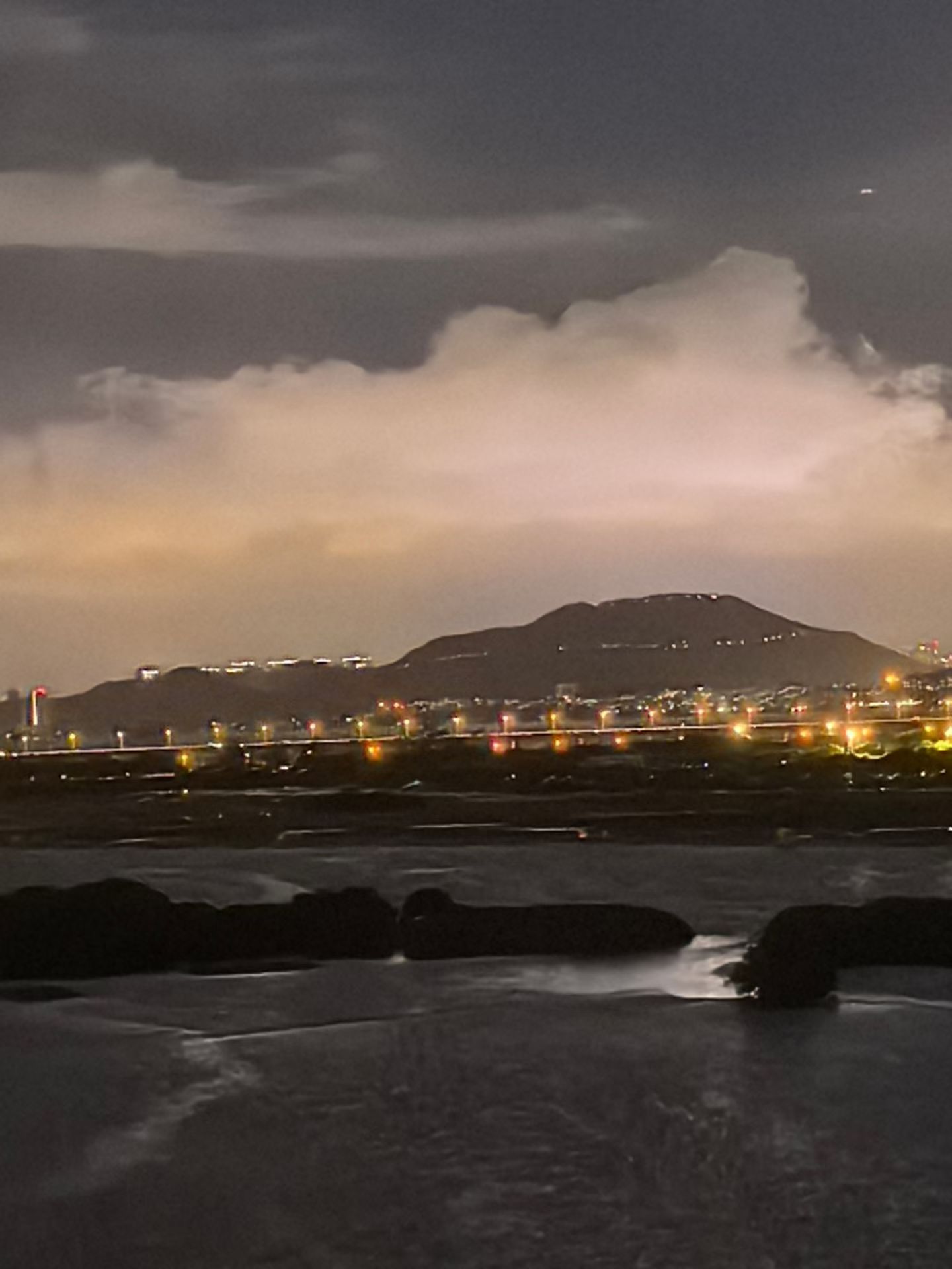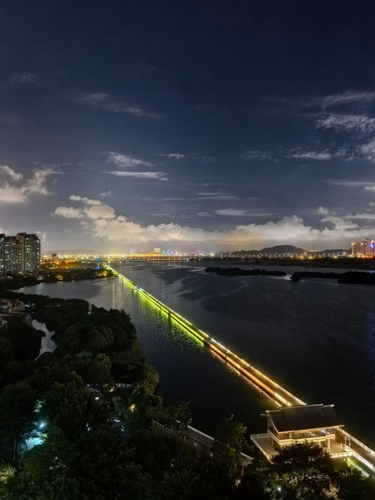 云缀夜空如绮,华灯长岸流金。波光潋滟映遥岑,湖郡流光隐隐。